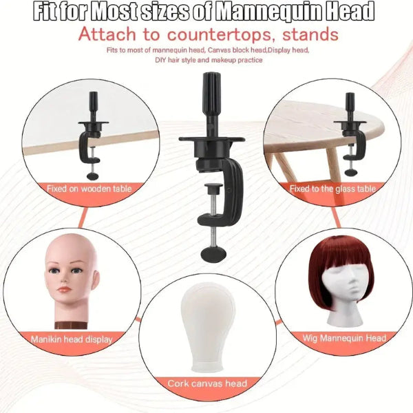 Crafted from durable, lightweight materials, it features an adjustable screw mechanism that fits most table edges, making it portable and easy to set up anywhere. Ideal for wig makers, hairstylists, and beginners, this clamp is a must-have tool for professional and personal use.