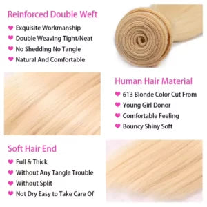 Upgrade your hair game with the 613 Blonde Straight Human Hair Bundles, made from 100% virgin human hair for a silky-smooth, natural finish.