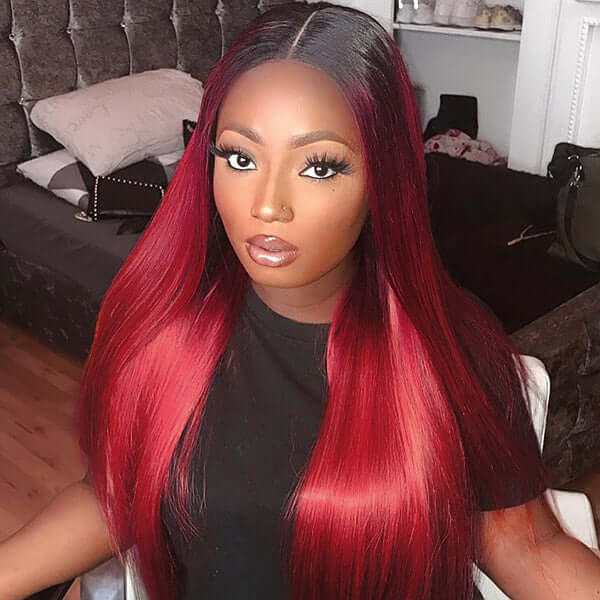 This closure blends natural black (1B) with rich burgundy tones, giving a bold yet elegant color transition. The 5×5 lace size offers more parting space than standard closures, ensuring a realistic scalp appearance and versatile styling options.